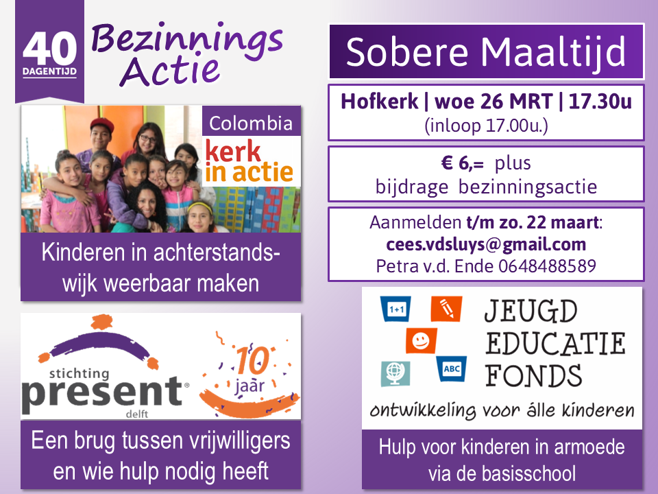 Woensdag 26 maart is er in de Hofkerk een Sobere maaltijd waar ook aandacht besteedt wordt aan de bezinningsdoelen. Deze maaltijd begint om 17.30u ( inloop 17.00u) Kosten zijn € 6,=  plus een  bijdrage voor de bezinningsactie. Aanmelden t/m zo. 22 maart: cees.vdsluys@gmail.com  of Petra v.d. Ende 0648488589
