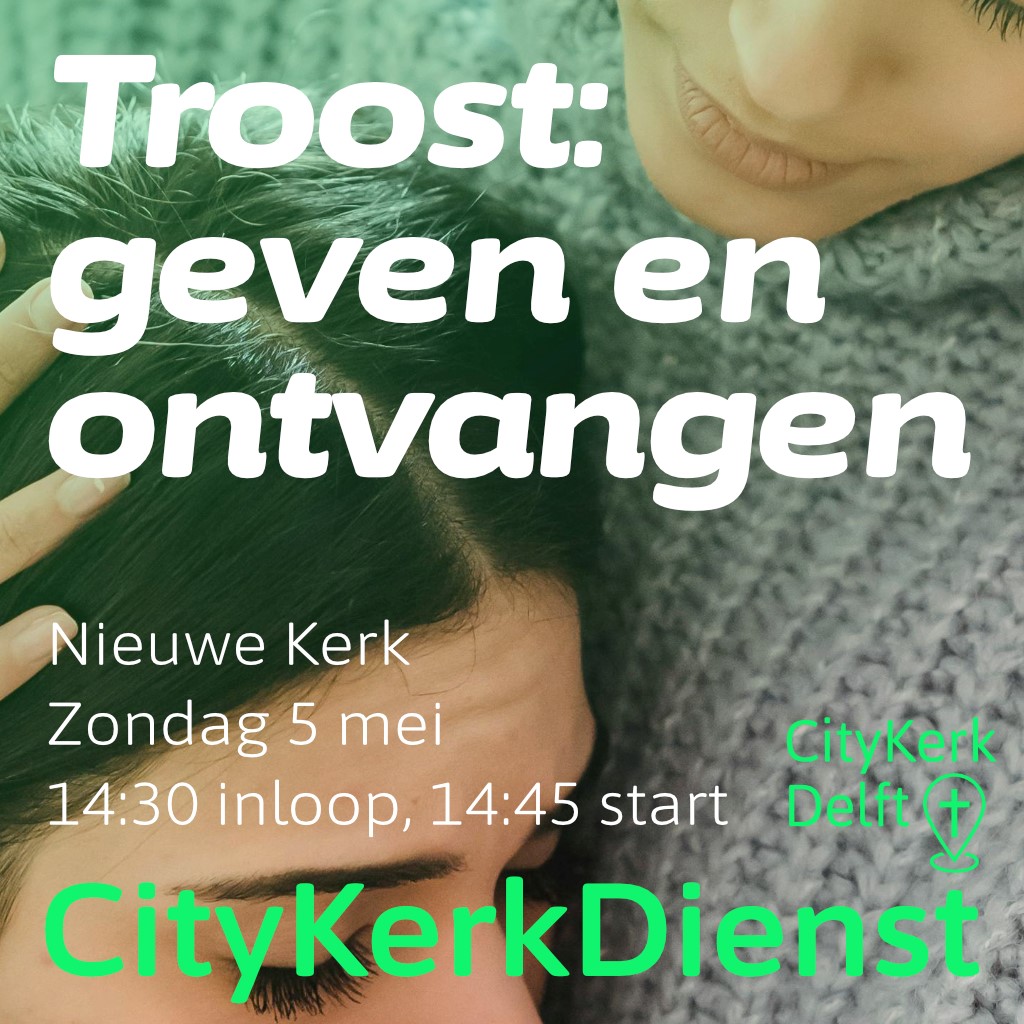 ‘Troost’ is het thema van het Feest van de Geest, een kunstroute langs 12 Delftse kerken in de periode van Hemelvaart tot en met Pinksteren. Kunstenaars uit de regio presenteren en exposeren nieuw gemaakte kunst, geïnspireerd op het Pinksterfeest en de architectuur van kerkgebouwen. Ook de CityKerkDienst van 5 mei staat in het teken van dit thema dat elk mensenleven raakt. Iedereen heeft te maken met verdriet, met pijn, met verlies en heeft daarin troost nodig. Troost is de steun die je ervaart als je weet dat jouw verdriet erkend en gezien wordt en je er niet alleen voor staat. We hebben het nodig troost te ontvangen, maar kunnen het ook geven. We lezen in de CityKerkDienst een prachtige tekst uit de Bijbel van de apostel Paulus die de troost die hij van God ontvangt ziet als een kans om anderen troost te geven.