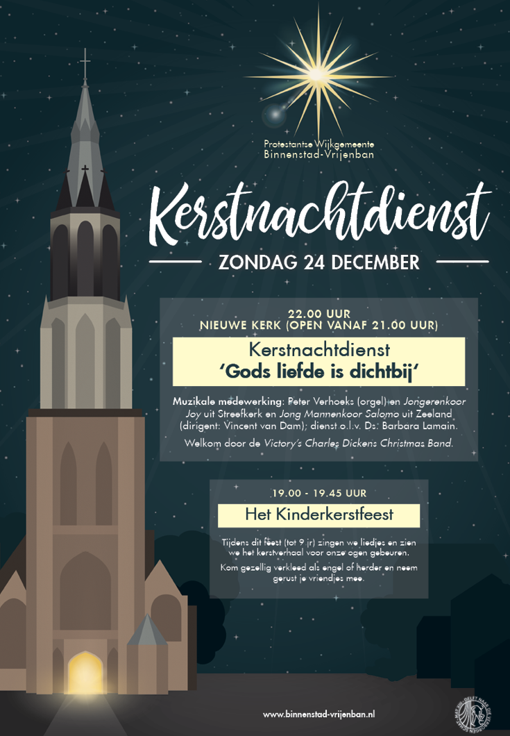 Op kerstavond, zondag 24 december, kan je het Kerstfeest vieren in een van de binnenstadskerken (Nieuwe Kerk, Maria van Jessekerk, Lutherse Kerk, Oud Katholieke Kerk).