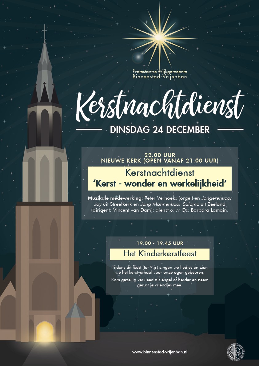Nieuwe Kerk, Markt 80, 19:00 Kinderkerstfeest, met liedjes en kerstspel; 22:00 Kerstnachtdienst met Christelijk Jongerenkoor Joy en Jong Mannenkoor Salomo