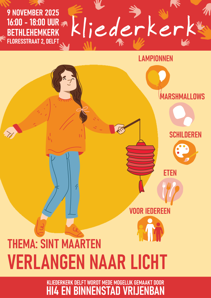 Van harte welkom bij de kliederkerk in het teken van Sint Maarten op zondag 9 november om 16.00 uur in de Bethlehemkerk (Floresstraat 2). Met afsluitend een lampionnenoptocht in de buurt. Kliederkerk is een open vorm van kerk-zijn waar jong en oud samen bezig zijn met creatieve activiteiten, luisteren naar een bijbelverhaal en samen eten. Dit keer staat het feest van Sint Maarten centraal, de romeinse soldaat uit de vierde eeuw die op een dag de helft zijn rode soldatenmantel deelde met een arme, naakte bedelaar. Naderhand zag hij in een droom dat hij zijn mantel met Jezus had gedeeld. Hij verliet het leger, liet zich dopen en werd uiteindelijk bisschop. Sint Maarten wordt officieel gevierd op 11 november, maar wij vieren het de zondag ervoor. Met dit feest lopen kinderen met lampionnen door de straat en krijgen wat lekkers van mensen bij wie ze aanbellen.