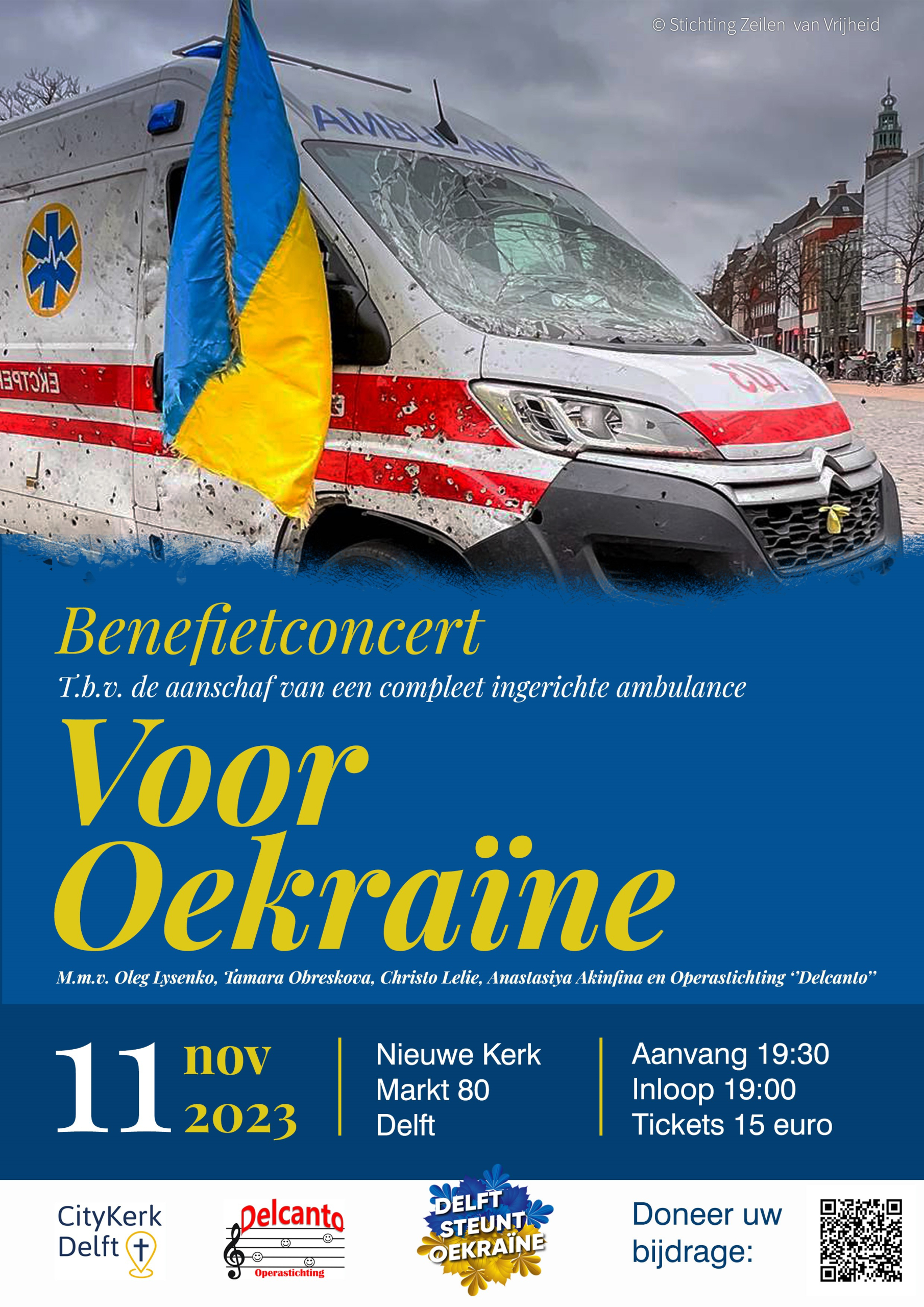 Nieuwe Kerk Markt 80, Delft, NederlandOp zaterdagavond 11 november vindt er om 19.30 uur in de Nieuwe Kerk een benefietconcert voor Oekraïne plaats. De opbrengst is voor een ingerichte, civiele ambulance, via de hulporganisatie Zeilen van Vrijheid, die al 164 ambulances heeft aangeschaft, ingericht en naar Oekraïne heeft gebracht. Er is daar dringend behoefte aan goed uitgeruste ambulances om levens […]